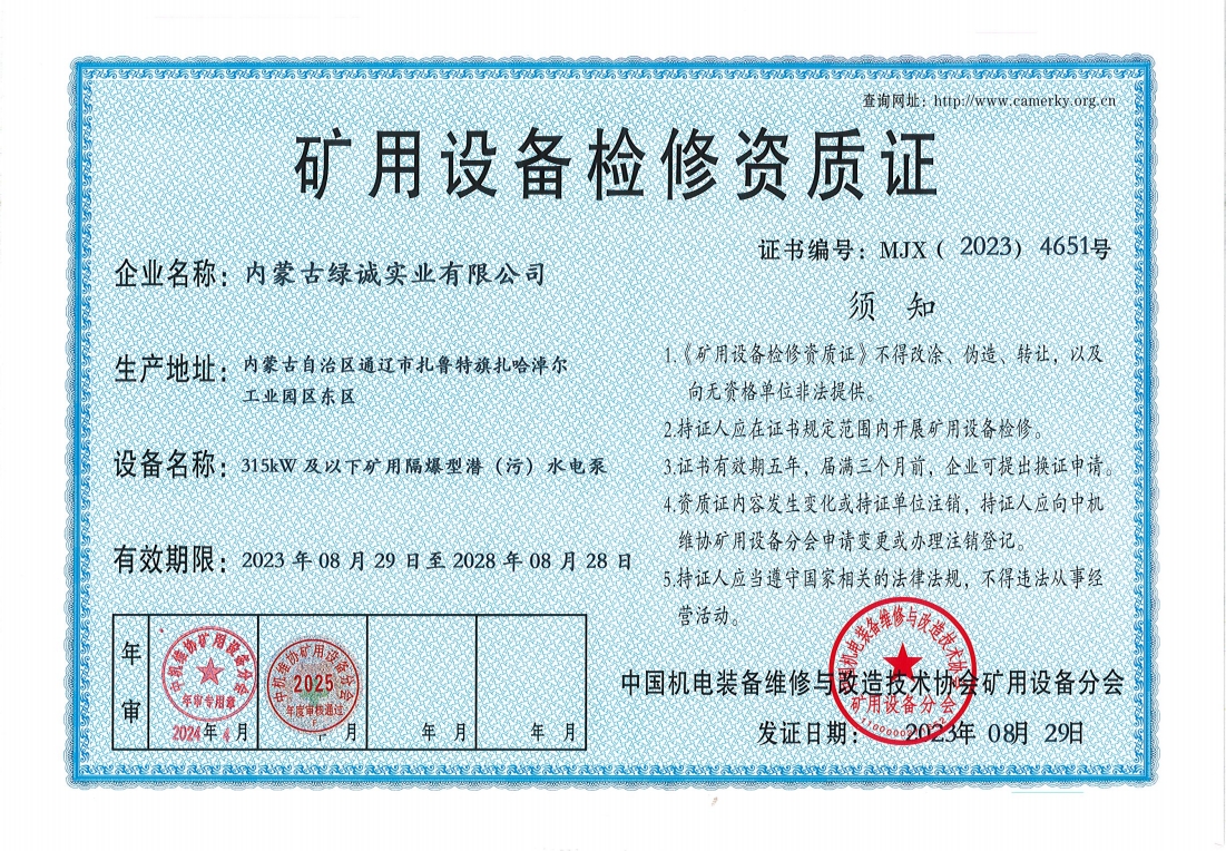 2018年我公司通過中國機電裝備維修與改造技術協會礦用設備分會審核并取得了9項礦用設備檢修資質證書。公司本著“誠信為本 質量為先 全心全意為客戶 ”的服務理念,圓滿完成各個廠礦的機械維修及配套服務,期待與您共同合作。